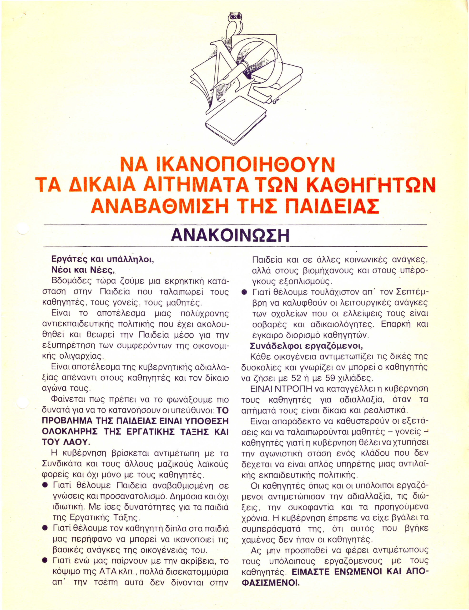 Να ικανοποιηθούν τα δίκαια αιτήματα των καθηγητών για αναβάθμιση της παιδείας